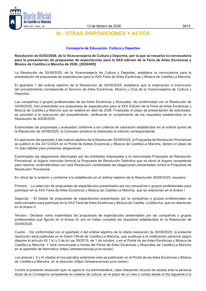 19 de febrero de 2026 | Categories: NOTICIAS | Comentarios desactivados en XXX FERIA DE ARTES ESCÉNICAS Y MÚSICA DE CASTILLA-LA MANCHA.