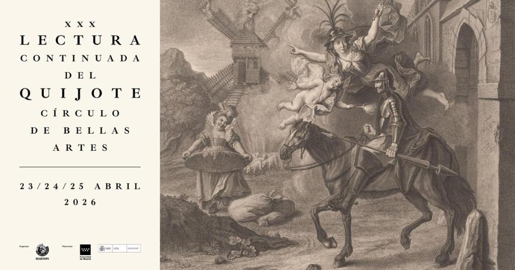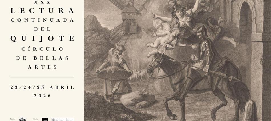 Esta tarde, a las 18h., comienza la Lectura Continuada del Quijote, uno de los principales actos organizados en torno al Día del Libro, que cumple este año su XXX edición. Las primeras líneas correrán a cargo del Premio Cervantes 2025, Gonzalo Celorio, al que seguirán el presidente del Círculo de Bellas Artes, Juan Miguel Hernández León; el ministro de Cultura, Ernest Urtasun; el alcalde de Madrid, José Luis Martínez Almeida y los embajadores de la República Federal de Alemania, Canadá, Francia, Suiza, Reino Unido y Japón. Participarán también los ministros José Manuel Albares, Fernando Grande-Marlaska, Elma Saíz y Óscar López. A partir de entonces, y a lo largo de cerca de cuarenta horas ininterrumpidas (hasta el sábado, 25 de abril), el Círculo será el foro de participación ciudadana más importante de Madrid y el lugar en el que miles de personas presten su voz al texto de Cervantes.