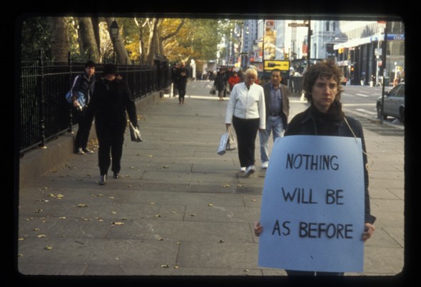 Durante más de una década, el trabajo de Sharon Hayes ha señalado las fricciones entre las acciones colectivas y los actos privados, examinando las estrategias de representación política tanto en su constitución histórica o archivística como en su re-actualización en un presente que sitúa el lugar de lo político entre lo personal y lo colectivo. Su obra ha desarrollado en performance, vídeo o instalación la memoria de las prácticas activistas en la escenificación de la protesta urbana, en el habla de los discursos públicos y en la organización de la manifestación y su puesta en escena. De esta manera, Sharon Hayes entrecruza historia, política y espacio público, recurriendo a su vez a aspectos cinematográficos, documentales y teatrales o performativos.