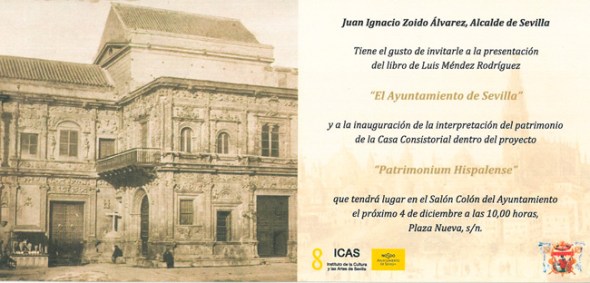 Presentación del libro de Luis Méndez Rodríguez «El Ayuntamiento de Sevilla» y a la inauguración de la interpretación del patrimonio de la Casa Consistorial dentro del proyecto «Patrimonium Hispalense» que tendrá lugar en el Salón Colón del Ayuntamiento el próximo 4 de diciembre a las 10,00 horas, Plaza Nueva, s/n.