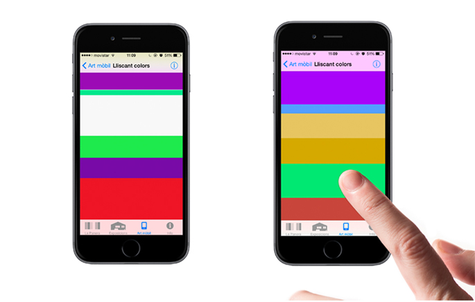 La aplicación Arte móvil fue creada a principios de 2012, y actualmente ya cuenta con seis piezas: Eternal Laberinth, 2012, de Ignacio Uriarte; Glassgate, 2012, de Juan López; Worlds Inside, 2012, de Marina Núñez; 64, 2013, de Abigail Lazkoz; Observed (Mil2), 2013, de Jordi V. Pou; y Deslizando colores, 2014, de Miquel Mont.