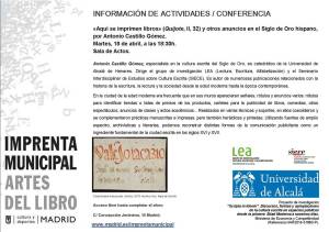 Imprenta Municipal: conferencia Aquí se imprimen libros (Quijote, II, 32)