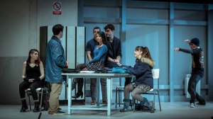 Simon Stephens, el autor del texto original de Punk Rock, es en este momento algo así como el rey Midas del teatro británico. Tiene una visión siempre interesante de la realidad y una buena mano como escritor para mezclar realidad y exceso estilístico. En Punk Rock hace uso de sus mejores ingredientes para ofrecer un texto sobrecogedor sobre la violencia en los colegios, tocando desde su versión más suave al bullying más despiadado, acabando en alto con una reflexión potentísima sobre los casos de violencia con armas de fuego. Aquí el texto nos llega en versión de José Luis Collado y dirección de José Luis Arellano, y lo que presentan está en general bien aclimatado, aunque la traducción se podría haber trabajado más para acercarla al habla de nuestros jóvenes. De cualquier forma, lo que ofrecen es un espectáculo sólido, de buenas interpretaciones y dirección sobresaliente. La Joven Compañía ha sido un regalo en cada montaje que han realizado hasta la fecha, y uno siempre tiene ganas de acercarse a sus propuestas. Víctor de la Fuente está francamente bien en el difícil papel del inestable William, Cristina Gallego, Ana Escriu y Katia Boriado hacen un buen mosaico de roles femeninos nada habituales, Fernando Sainz de la Maza trabaja un buen personaje de acosado y Jota Haya y Juan Frendsa bordan la carga violenta de la obra. En septiembre retomarán la gira de Punk Rock, así que habrá nuevas oportunidades de verles por España. El montaje es una recomendación clara si les gusta el teatro instalado en la realidad, el no complaciente, el que busca remover al espectador en su butaca con los grandes temas de nuestro tiempo.