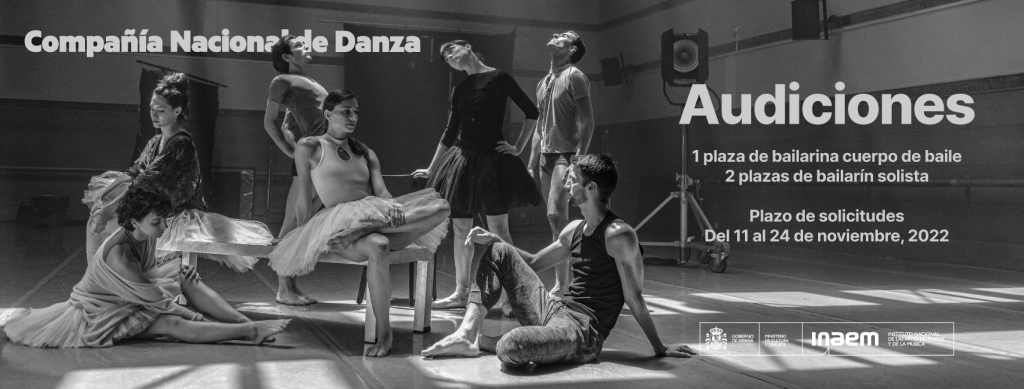 | Procesos selectivos para la cobertura de puestos de personal laboral temporal en el INAEM Abierto el proceso de presentación de solicitudes para las siguientes plazas en la Compañía Nacional de Danza:1 plaza de bailarina cuerpo de baile de la Compañía Nacional de Danza (procedimiento selectivo nº 309)2 plazas de bailarín solista de la Compañía Nacional de Danza (procedimiento selectivo nº 310)Plazo de presentación de solicitudes: Desde el 11 de noviembre de 2022 Hasta el 24 de noviembre de 2022 Para más información puede consultar la web del Ministerio de Cultura y Deporte: https://www.culturaydeporte.gob.es/servicios-al-ciudadano/catalogo/general/99/998563/2022.html Para cualquier información sobre cómo formar parte de la Compañía Nacional de Danza pueden contactar con audiciones.cnd@inaem.cultura.gob.es Toda la información en Audiciones CND |