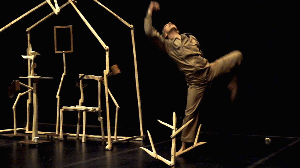 En esta danza de objetos que presenta NOWHEN hay una radio como compañera de viaje, que pone sobre la escena la aleatoriedad de lo que se está emitiendo en los diferentes canales. También hay una estructura de listones de madera que se van ensamblando desde la geometría abstracta hasta el esqueleto de una casa, estable y frágil a un tiempo. También unos tubos fluorescentes, nube y luz de trabajo.