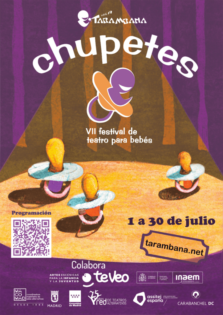 Sala Tarambana Del 1 al 30 de Julio del 2023 La Sala Tarambana siempre ha mostrado un firme compromiso con el público infantil y familiar y cada temporada ofrecen las mejores propuestas a nivel escénico para los más pequeños. El teatro infantil está en el ADN de la sala, por eso vuelve, un año más, Chupetes, la VII Edición de este Festival de Teatro para Bebés, una iniciativa que pretende fomentar las artes en los primeros años de vida de los niños.