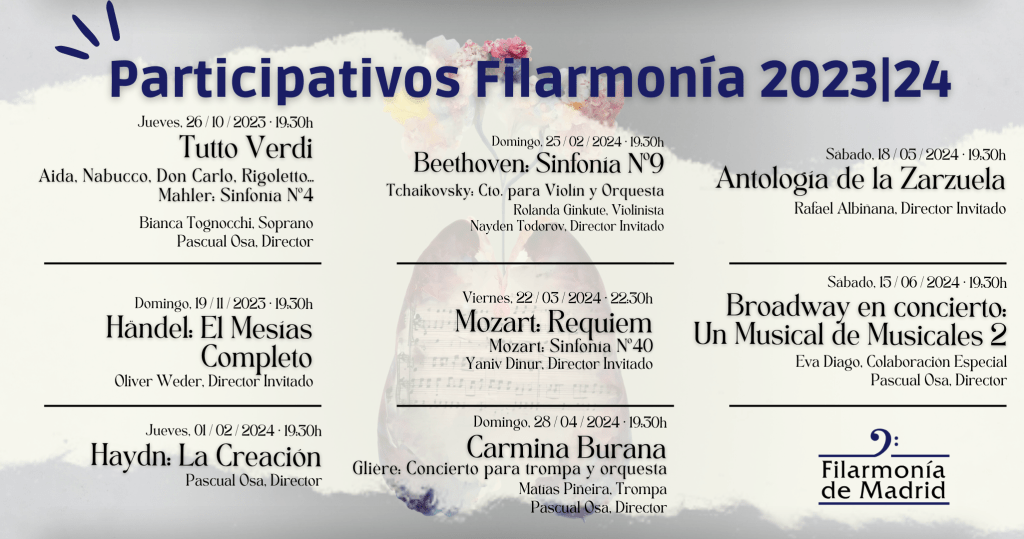 LosPARTICIPATIVOS FILARMONÍAnacieron hace más de 10 años y ya han pasado por nuestros conciertos miles de coristas amateur que han podido cumplir un sueño: cantar en el Auditorio Nacional.