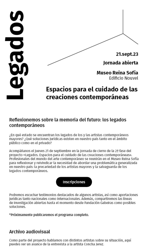 | ConvocatoriasIII Convocatoria NUDO/KNOT para artistas e investigadores 2023Inéditos 2023Convocatoria de Tabakalera de residencia para el desarrollo de proyectos artísticos 2024 | ExposicionesElogio de lo cursi (CentroCentro, Madrid)Erwin Olaf. Un mundo que se desvanece (Centro Niemeyer, Avilés)Nancy Holt / Dentro Fuera (MACBA, Barcelona)Trascity. Alberto Feijóo (IVAM, Valencia) |