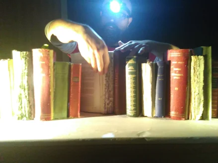 Llegar a ese pequeño espacio y sentarse junto a los libros, aquellos que están puestos en fila y dispuestos para enfrentar la escena. Adolfo Simón, antes de comenzar el espectáculo, nos dice en sordina: “Buen viaje”. Y eso bastará para adentrarnos a ese paraíso perdido que se halla entre los sueños y la vigilia, entre la noche y la luz diminuta de las estrellas.