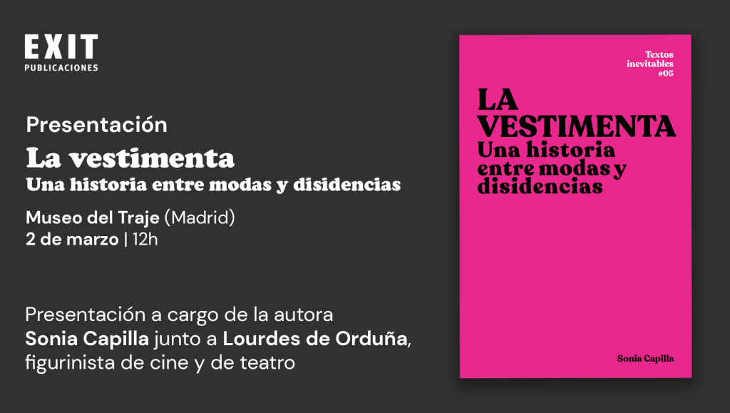La Vestimenta. Una historia entre modas y disidencias en el Museo del Traje de Madrid, (Biblioteca, 1º planta). En la presentación intervendrán la autora del libro, Sonia Capilla y Lourdes de Orduña, figurinista de cine y de teatro. Asistencia libre hasta completar aforo.