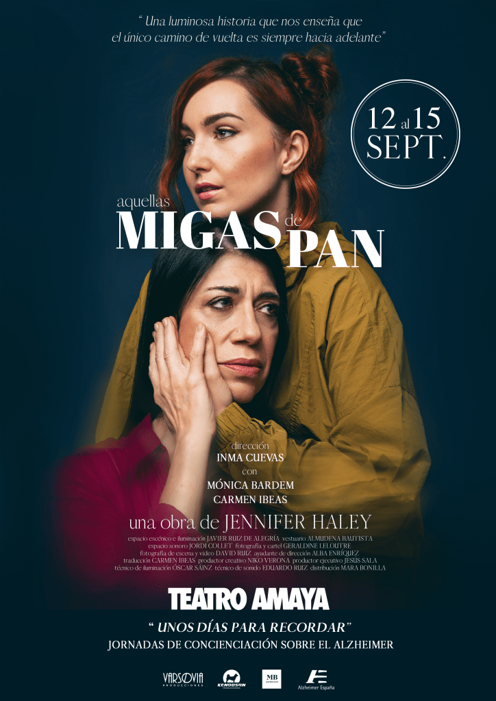| Miércoles, 17 de julio de 2024.- Con motivo del Día Mundial del Alzheimer, el Teatro Amaya de Madrid acogerá las Jornadas de concienciación sobre el Alzheimer ‘Unos días para recordar’ que se celebrarán desde el 12 hasta el 15 de septiembre. Durante el evento, tendrán lugar las funciones solidarias de la obra Aquellas migas de pan (Breadcrumbs), de la multipremiada autora norteamericana Jennifer Haley, magistralmente interpretada por Mónica Bardem y Carmen Ibeas, bajo la dirección de la también actriz Inma Cuevas. Durante los cuatro días, desde por la mañana hasta por la tarde, los espectadores que compren la entrada para la obra de teatro podrán asistir a varias actividades organizadas por la Fundación Alzheimer España para concienciar al público sobre esta enfermedad. Entre las actividades los asistentes podrán asistir a un taller de musicoterapia orientado a vivenciar el poder de la música para evocar recuerdos y mejorar el estado emocional o un escape room en donde el espectador puede experimentar la sintomatología que presenta un paciente. Tras las representaciones, se realizará un coloquio con el público, que contará con la presencia del equipo artístico de la obra, así como con expertos en el campo de las enfermedades neurodegenerativas, que hablarán del Alzheimer desde el punto de vista artístico y clínico. La Fundación Alzheimer España y las productoras de la obra Varsovia Producciones —fundada por la propia Ibeas y el también actor Niko Verona— y Kendosan Producciones organizan estas jornadas. Las entradas ya se encuentran a la venta en el siguiente enlace: AQUELLAS MIGAS DE PAN – TEATRO AMAYA MADRID con precios desde 11,00€. La recaudación irá destinada a la FAE. La obra se representó con éxito de crítica y público en el Teatro Infanta Isabel del 11 de mayo al 4 de junio de 2023, y el pasado 19 de septiembre de 2023 tuvo lugar de la mano de la Fundación Alzheimer España (FAE) una única representación especial en el Teatro Fígaro de Madrid con motivo del Día Mundial del Alzheimer, que contó con un coloquio posterior con el equipo artístico y expertos de la FAE. Las jornadas darán el pistoletazo de salida a la gira solidaria ‘Una tarde para recordar’ que contará con el nuevo formato (representación y posterior coloquio de expertos en el campo de las enfermedades neurodegenerativas). La gira arrancará el 19 de septiembre en el Teatro de las Esquinas de Zaragoza y continuará por todo el territorio nacional de la mano de la Fundación Alzheimer España (FAE). La Fundación Alzheimer España (FAE) desde hace más de treinta años ofrece orientación y apoyo a los pacientes, sus familias y su entorno, al tiempo que trabaja para sensibilizar a la opinión pública con el fin de erradicar estigmas e ideas preconcebidas sobre la enfermedad. Sinopsis Aquellas migas de panLuminosa y otoñal historia de una escritora recién diagnosticada de una demencia temprana, que recurre a una joven y caótica cuidadora para terminar de escribir sus memorias antes de perder por completo sus recuerdos. Entre ellas se creará un vínculo tan frágil como indestructible que las convertirá en dos mujeres aliadas frente a todos sus abismos personales, navegando por sus vivencias en un onírico viaje que las llevará a lo más profundo de su pasado. “…el único camino de vuelta a casa es siempre hacia adelante. Hacia la luz”. |