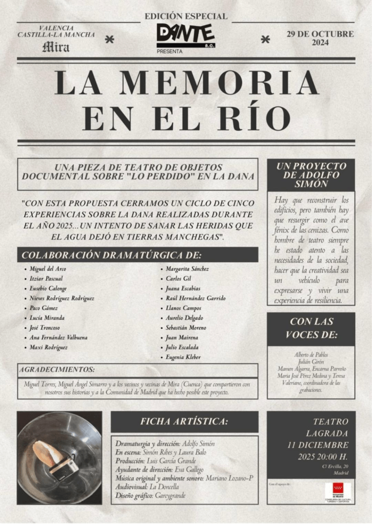 El río se presenta como una fuerza que arrasa, pero también guarda, mezcla y devuelve recuerdos transformados. El ritmo pausado invita a mirar con atención, a detenerse, algo cada vez más raro tanto en escena como en la vida diaria.