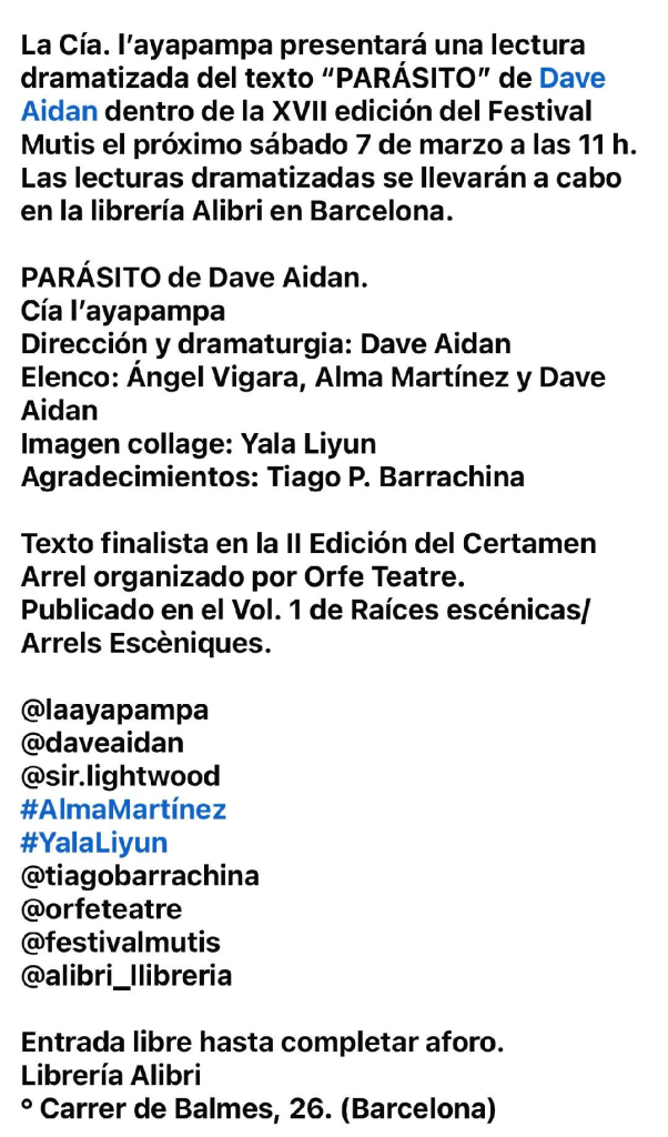 Lectura dramatizada de «Parásito» en la XVII Festival MUTIS.