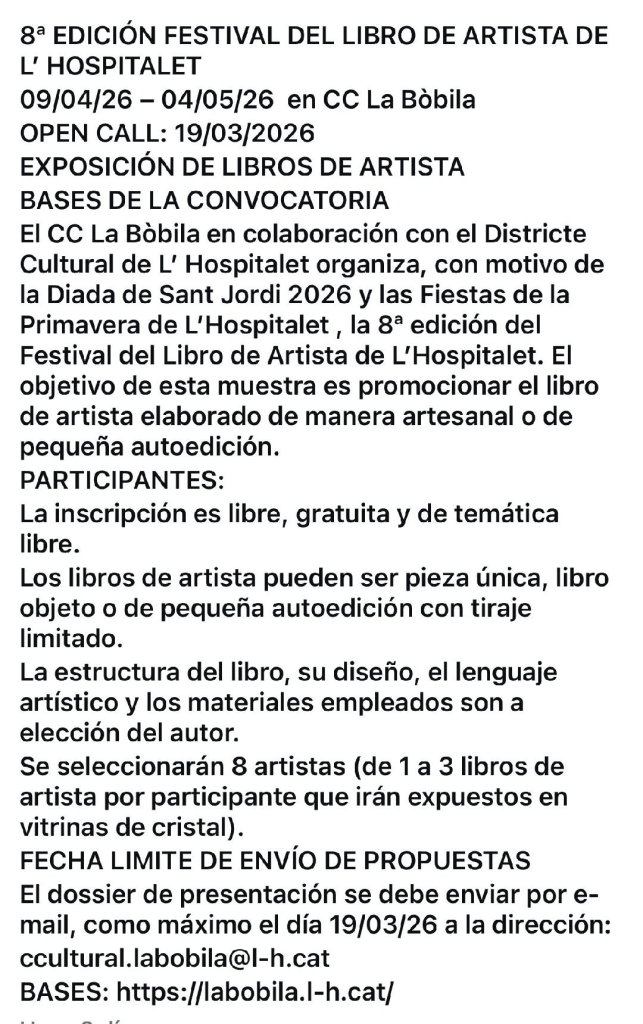 | ConvocatoriasI Convocatoria de investigación, residencia y producción artística (CACiS – Centre d’Art Contemporani i Sostenibilitat, Barcelona. Hasta el 20 de marzo de 2026).Hasselblad Foundation’s International Photo Book Grants (Hasselblad Foundation, Göteborg, Suecia. Hasta el 1 de abril de 2026).VI Convocatoria de Creación y Producción Artística Pablo Serrano/Juana Francés (IAACC Pablo Serrano, Zaragoza. Hasta el 20 de abril de 2026).V Edición del Premio Internacional de Investigación y Ensayo (Centro de Arte Fundación María José Jove, A Coruña. Hasta el 24 de julio de 2026). ExposicionesRobert Rauschenberg: Life Can’t Be Stopped (Solomon R. Guggenheim Museum, Nueva York. Hasta el 3 de mayo de 2026).FOD. fueradentro (Centrocentro, Madrid. Hasta el 15 de marzo de 2026).Leonora Carrington: portrait d’une artiste singulière (Musée du Luxembourg, París. Hasta el 19 de julio de 2026).Standing Here Wondering Which Way to Go (Tabakalera, Donostia. Hasta el 14 de junio de 2026).Jasmijn Vermeeren. You Don’t Look Sick (Foam, Ámsterdam. Hasta el 25 de mayo de 2026). |