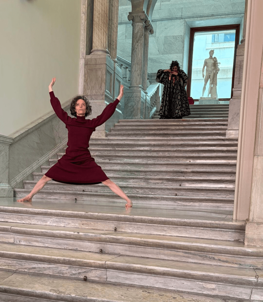 Dentro de «Ellas crean»…Halo de Melania Olcina Yuguero, despliega un poema físico, respirado y escuchado a través del cuerpo, imaginado como un instrumento de viento que inhala y exhala el relato de una metamorfosis. Un periplo corporal sobre las escaleras del Museo Arqueológico Nacional, con el espacio sonoro de Fátima Cué surcando el aire, atravesando las perspectivas del lugar y su memoria.
