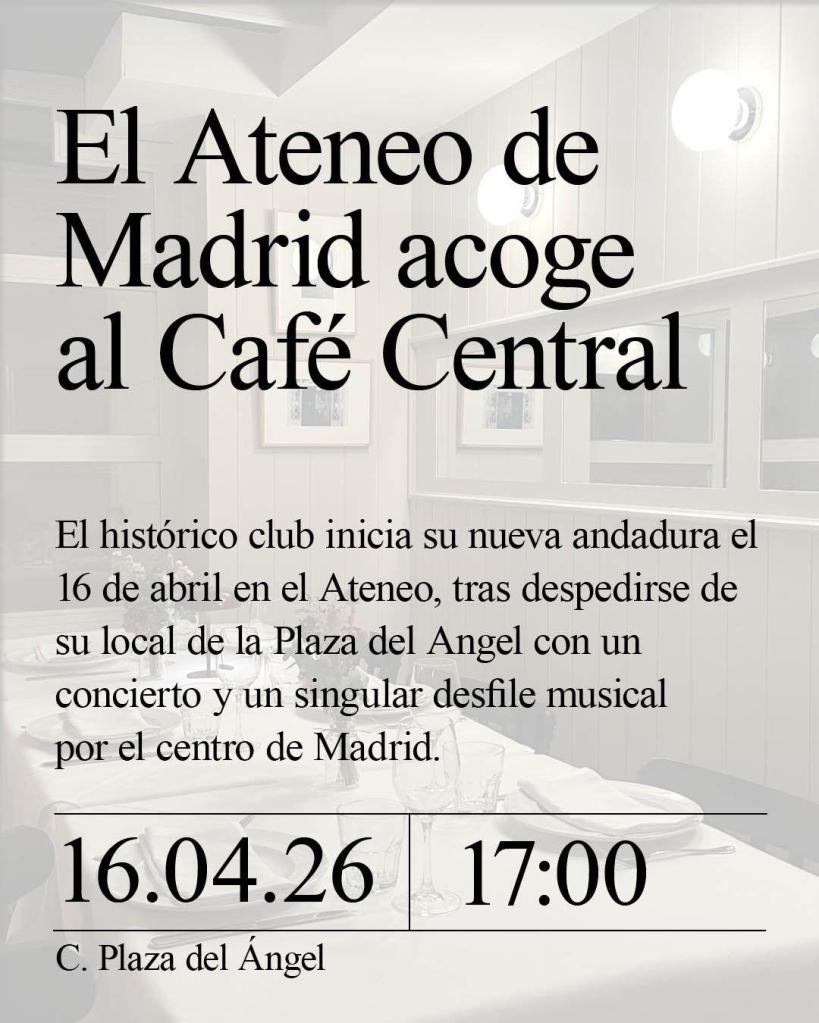 EL ATENEO DE MADRID ACOGE AL CAFÉ CENTRAL, EL TEMPLO DEL JAZZ EN LA CAPITAL Tras más de cuatro décadas de historia, cerca de 15.000 conciertos y más de un millón de asistentes, el Café Central inicia una transformación que trasciende el cambio de ubicación para convertirse en un ejercicio de continuidad y renovación. El 15 de abril tendrá lugar el último concierto en su local histórico de la Plaza del Angel, a cargo de Miguel Malla Project, formación que inaugurará al día siguiente el nuevo espacio en el Ateneo, simbolizando el puente entre pasado y futuro. Sin salir del Barrio de las Letras, el Café Central ha encontrado en el Ateneo un lugar idóneo donde combinar la experiencia musical en vivo con un buen cóctel o una cena. “Desde que el pasado verano supimos que el Café Central tenía que dejar su sede pensamos que el Ateneo podría ser un sitio excelente. Desde entonces la conversación ha sido fluida y mutuamente inspiradora para que dos marcas legendarias de la cultura española – Café Central y Ateneo de Madrid – unan fuerzas para que la mejor música siga sonando”, afirma Luis Arroyo, presidente del Ateneo. Por su parte, Javier González, responsable de programación del Café Central, señala que “vivimos un momento histórico, como tantos otros que ha protagonizado el Central, pero con una dimensión que impacta a la ciudadanía como nunca antes lo había hecho para nosotros. Afrontamos esta etapa con emoción, impulsados por la extraordinaria acogida del Ateneo y con la certeza de que sabrán cuidar, como merece, toda la energía, la historia y las vivencias que les confiamos a través de la música. Estamos convencidos de que Tete Montoliu, George Adams, Barry Harris, Jeanne Lee, Pedro Iturralde, Javier Krahe y tantos otros que ya forman parte de la leyenda del Central se sentirían orgullosos de ver cómo su legado continúa en el Café Central Ateneo.” El traslado estará acompañado de un acto abierto al público bajo el nombre de “Funeral y Resurrección de Jazz”, que se celebrará el 16 de abril a las 17:00 horas. Inspirado en las tradicionales ‘marching bands’ de Nueva Orleans, el cortejo musical partirá desde la Plaza del Ángel hasta la sede del Ateneo en la calle Prado y Santa Catalina. Músicos,aficionados y ciudadanos están invitados a participar en este recorrido que busca trasladar simbólicamente la energía, la memoria y la historia del Café Central a su nuevo hogar. El Café Central mantendrá su formato habitual de dos conciertos diarios durante todo el año, consolidando un espacio de encuentro para los amantes de la música en directo en pleno Barrio de las Letras.