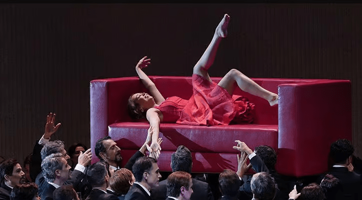 Una producción sobria, centrada en los personajes protagonistas, en un espacio simbólico que genera una mirada más contemporánea de esta emblemática obra. Mas teatral que otras producciones que se han disfrutado en el coliseo madrileño. Los coros en esta propuesta son un elemento atmosférico que acompaña poéticamente la acción mientras la música eleva las emociones del público al máximo. La Traviata sin una cantante excepcional quedaría frágil, aquí, por suerte, la protagonista realiza un trabajo actoral y de canto magistral, como pocas veces se suele ver en los escenarios operísticos, una experiencia fantástica.