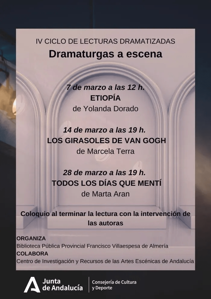 El IV Ciclo de Lecturas Dramatizadas, Dramaturgas a Escena, está organizado por la Biblioteca Pública Provincial Francisco Villaespesa en colaboración con el Centro de Investigación y Recursos de las Artes Escénicas de Andalucía (CIRAE).