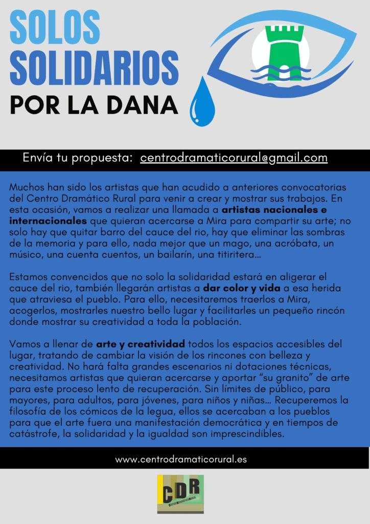 ¿Eres músico, coreógrafo, bailarina, intérprete, titiriteo, cantante, artista de circo, mago…?… Tienes un escenario esperándote en Mira… ¡Llenemos de magia un pueblo herido! Recuperemos para el pueblo la sonrisa y la emoción que alivie el golpe recibido.