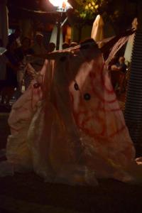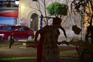 Tras diferentes fases de prueba y construcción poético-escénica, dos días antes se concretó la dramaturgia insólita…La Torre vieja que alberga objetos y materiales de la historia del lugar iba a ser la protagonista, ella, invisible para los que pasan por delante cada día, quería volver a ser el faro de la historia guardada con esmero entre sus muros. Allí empezaría el periplo de unos seres que saldrían de sus entrañas para transitar por las calles, lugares y plazas de San Clemente, en ese periplo, encontrarían sus espacios de memoria en forma de instalación plástica. Como en toda historia épica, las fuerzas del bien y del mal entraron en combate…La memoria contra el olvido, la belleza contra el horror.