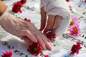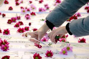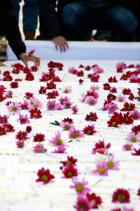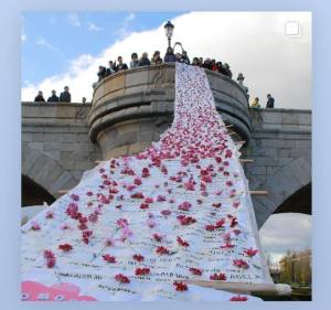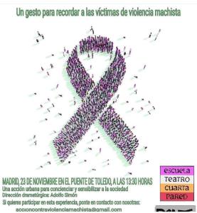 Ya es 26 de noviembre, hemos pasado todo el día 25 conmovidos porque, desgraciadamente, hoy se sumó un nombre a la interminable lista de mujeres asesinadas por violencia machista. El sábado pasado hicimos un gesto necesario, un gesto poético y emotivo para recordar, una a una, a todas las que fueron asesinadas y han sido contabilizadas desde 2003…Más de mil!… Las nombramos y pusimos su nombre junto al de todas las demás, con una margarita que acompañase su nombre…para que, en ese momento, dejarán de ser un dato en una lista. Cerramos la acción con un gesto en lengua de signos repudiando la violencia patriarcal…Y desplegamos la pancarta sobre el muro del Puente de Toledo…tantos nombres hay ya que llegó la pancarta al suelo…¿Hasta cuándo?…¿No vamos a ser capaces de mirar de frente a este tema y dar la cara por ellas?…En algún momento tendremos que dejar de pensar que el problema lo tienen los demás o que esto afecta todos y a nadie como algunos políticos plantean. Cuando una sociedad y el arte solo se miran el ombligo y no son capaces de reaccionar ante algo tan terrible como es esta herida social, no podremos decir que somos una sociedad evolucionada y digna. ¡Basta ya de matar por ser mujer!. No las olvidemos…SOMOS ELLAS!.