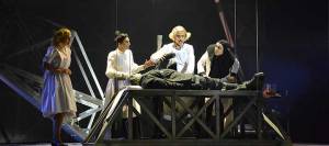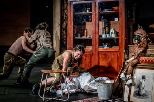 La alteración principal de la novela en la pieza teatral es el cambio en la narración, que es en primera persona y en la voz de una mujer, interpretada por la fantástica Viviane De Muynck, habitual en los montajes de Lauwers. Pero como vimos en The blind poet, también hay danza y música en escena. Estamos acostumbrados a la imagen de la muerte como una figura encapuchada con una guadaña en la mano y el horror lo asociamos a historias de terror fantástico y sin embargo, puede que el mayor horror esté más cerca de lo que creemos, tal vez forma parte de nuestras células, de lo que se aloja en los recovecos de nuestro cerebro y memoria. Jan Lauwers nos empuja a un precipicio donde el espacio sonoro es la voz de una mujer entrañable que nos cuenta el horror como si fuese una narración amable, solo que esa palabra susurrada despierta los monstruos que habitan en nuestros interior. En War and Turpentine aparentemente nos hablan de los desastres de la guerra pero, en realidad, nos muestran las dos caras del homo sapiens, la cívica y la animal, en una puesta en escena desestructurada que potencia ese salto a otra dimensión del comportamiento humano. Estremecedora e impactante a partes iguales, desconcierta por momentos para sacudirnos en el instante siguiente, cuando menos lo esperamos con dosis de horror y delirio.