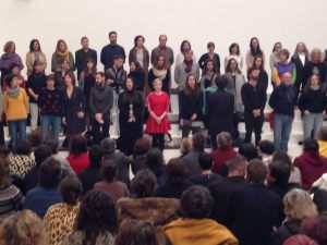 Este fin de semana ha tenido lugar la última performance de Esther Ferrer sobre el ciclo que organiza el Reina Sofía. Para ello se ha llevado a cabo la pieza “Concierto ZAJ para 60 voces”, esto trata de reunión de voces sin discriminación de sexo, edad o condición, dirigidas como una orquesta por la propia artista. Cada intérprete puede decir, recitar o cantar la frase correspondiente solo una vez o repetirla las veces que desee durante el espacio de un minuto, cambiando si quiere de idioma, entonación, etc…