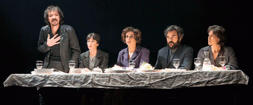 Buñuel está bajo la mesa ceremonial llenando de hormigas los zapatos de Edipo y sobre las cabezas de estos comensales malditos sobrevuela el ángel exterminador. Creo que la austeridad de la propuesta le va muy bien a la obra para que entendamos de manera profunda, hoy, lo que significa ser un invitado de piedra a la cena de su propio velatorio. La idea de coro como voces en canon y el reparto de roles según lo va necesitando la acción consigue que el cuento de este niño torpe que quiere huir de su destino para tropezarse con él a cada paso se vuelva transparente y hace que esta versión sea una de las más sorprendentes que he visto en mucho tiempo.