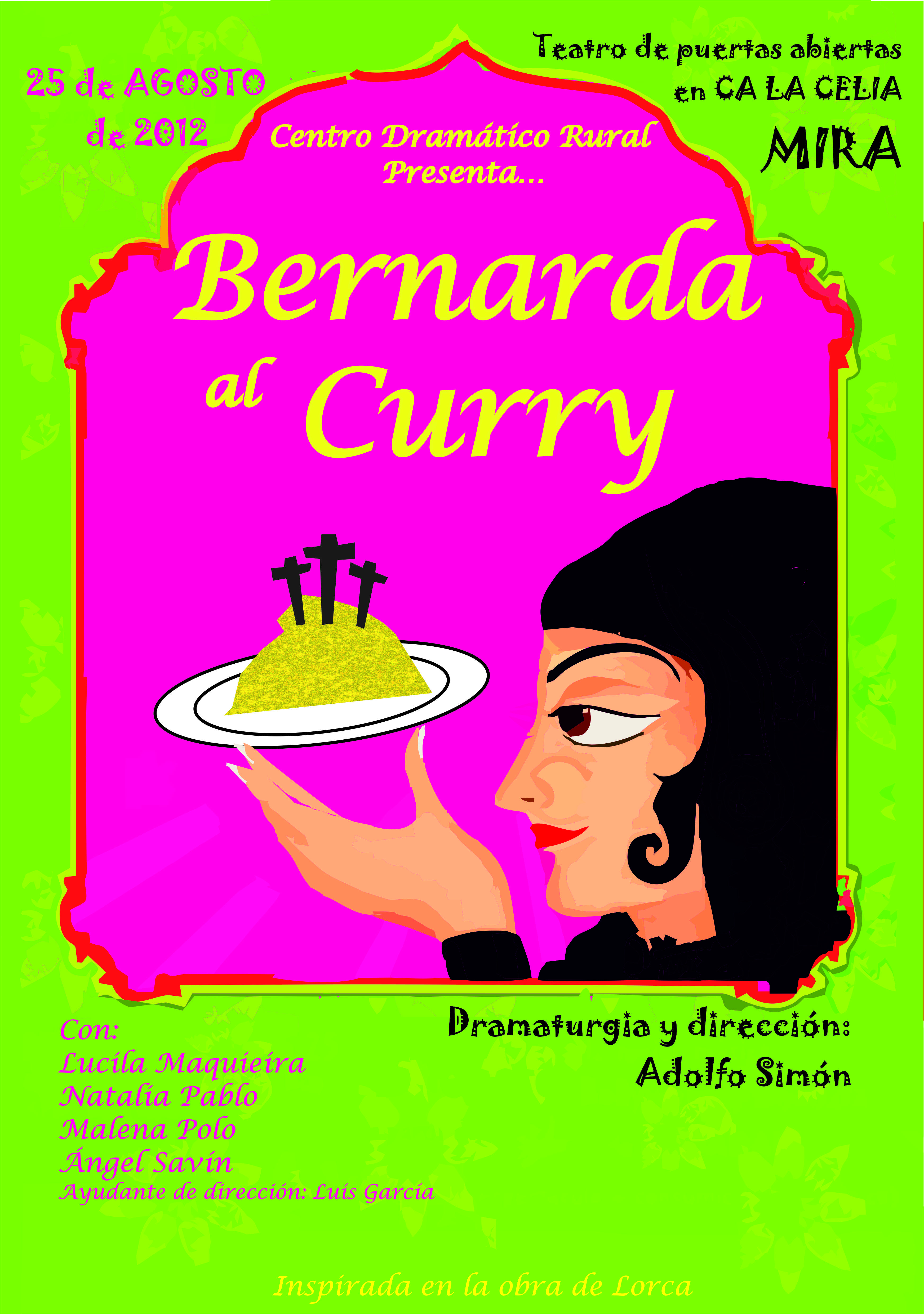 Crea el Centro Dramático Rural y presenta en un ambiente natural, el escenario es la entrada de una casa de pueblo con un patio y un mundo de habitaciones perdidas al final de una escalera y un patio corrala oscuro con una profundidad de pozo negro donde los personajes escogidos para este Curry serían Bernarda, Poncia, Adela y Josefa y entre escenas literales de Bernarda Alba y otras creadas por la realidad de lo cotidiano, donde los actores son ellos mismos, aparece esta salsa curry que envuelve al texto lorquiano y el precio de la entrada sería lo que la gente nos pueda dar de alimentos o de su trabajo, nosotros les damos nuestro oficio y ellos nos dan de lo que hacen, era volver al origen, se me pone la carne de gallina ahora que lo escribo. Nos embarcamos para estar una semana entera en Mira, todos juntos conviviendo y trabajando el texto de la obra y practicando improvisaciones de lo actual, con tres coplas que marcan los ángulos de esta propuesta de función, Lucila Maquieira (Josefa), Magdalena Polo (Poncia), Natalia Pablo (Adela) y el que suscribe Bernarda, junto a Simón y a Luis María García Grande (ayudante de dirección). La experiencia ha sido maravillosa, la convivencia sin roces, con lo difícil que es, todos buscando el placer de reencontrarnos con el alma de unos personajes rurales en el medio rural y el placer de estar con amigos, que luego se trasmite en escena. El pueblo ha respondido con una entrega y una generosidad que emociona, entregados en las funciones que representamos haciéndonos sentir una proximidad, que si de por sí lo era física, estaban sentados como invitados en el patio, casi espiritual, unas funciones donde hemos dado y recibido amor del bueno, del que queda en el corazón para toda la vida. Mi deseo y creo que el de todos, volver, regresar a Mira con cuestas hermosas que te meten en la montaña y gentes hermosas que te miran a la cara con honestidad que nos ha dado su aplauso y sus frutos, que más puede pedir un actor.