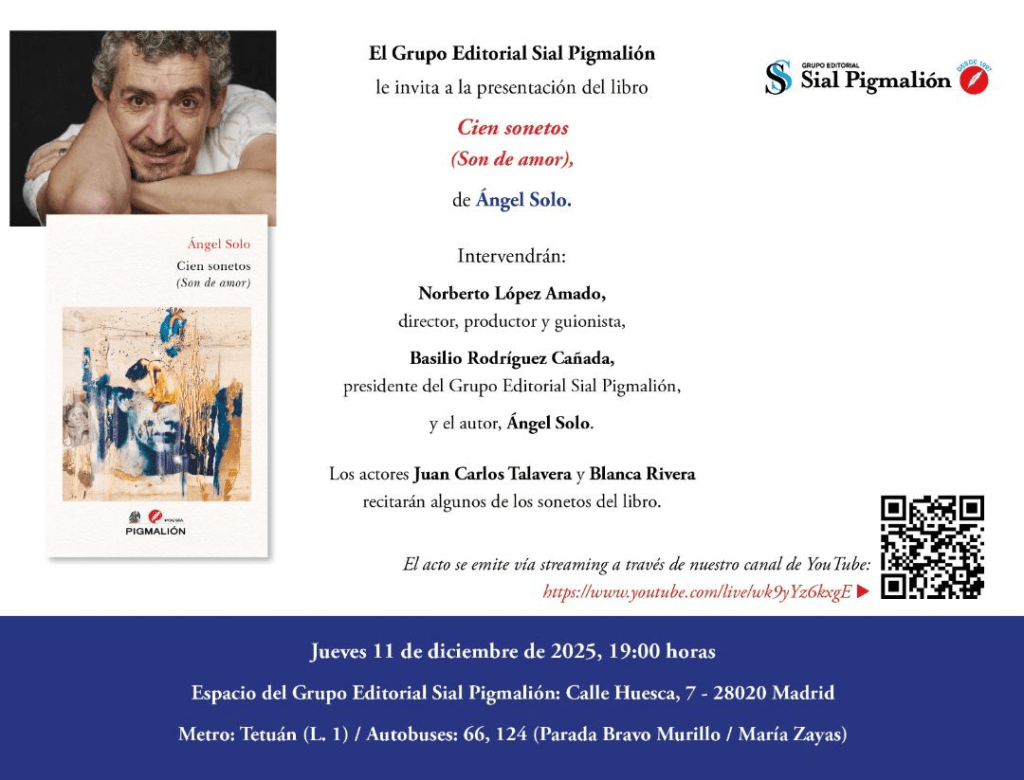 3 de diciembre de 2025 | Categories: NOTICIAS | Comentarios desactivados en Presentación del libro: Cien sonetos (Son de amor) de Ángel Solo.