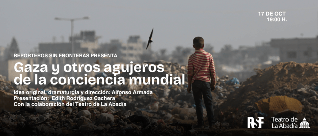 El próximo 17 de octubre a las 19:00 horas, la Sala Juan de la Cruz del Teatro de La Abadía abrirá sus puertas a “Gaza y otros agujeros de la conciencia mundial”. Un evento en el que, con la esperanza de un alto al fuego real y permanente y de que la barbarie nunca más se repita, se hace un homenaje a las víctimas de Gaza. El acto está organizado por Reporteros Sin Fronteras España, en colaboración con el Teatro de La Abadía y coordinado por Alfonso Armada, presidente honorífico de la sección española de RSFEn el acto se leerán textos enviados desde Gaza, publicados en la prensa española, así como testimonios, cartas y textos diversos de otros territorios que sufren también la barbarie como Ucrania, Siria, Sudán o Afganistán