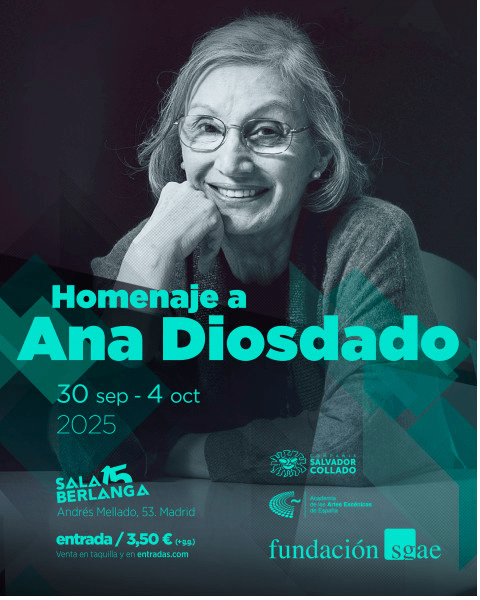 Bajo el título Homenaje a Ana Diosdado, la Fundación SGAE organiza hasta el 4 de octubre en la Sala Berlanga de Madrid (C/Andrés Mellado, 53. Entradas: 3,50 euros. A la venta en taquilla y en entradas.com +g.g .) tres lecturas teatralizadas de libretos de la dramaturga que se combinan con la exhibición de dos películas: Algo amargo en la boca de Eloy de la Iglesia (1969), con guion de Diosdado, y Las llaves de la independencia de Carlos Gil (2005), película histórica basada en una novela de su autoría, adaptada por ella misma. Antonio Onetti, presidente de SGAE, inaugurará el homenaje a las 19.30 horas el 30 de septiembre.