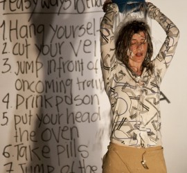 Una Forma Fácil de Acabar con Todo de María M. Cabeza de Vaca es un solo de danza-performance que reflexiona con sentido del humor sobre la existencia. Inspirado en un breve texto de la artista Louise Bourgeoiss: “7easy ways to end it all” que trata el tema del suicidio, utiliza el concepto final como motivo recurrente, tanto a nivel formal como argumental. “Final” entendido no como una manera definitiva de acabar con todo, sino como transición necesaria para cerrar etapas, es decir como “motor de cambios”. No hay mejor manera de enfrentarse al suicido y a la vida que con humor negro y con distanciamiento e inteligencia. De otro modo no es posible. La intérprete, en esta pieza, nos lleva por siete paisajes, como las vidas de un gato, para mostrarnos que el horror está a un paso de la carcajada y que si nos tomamos todo tan a la tremenda, igual nos perdemos algo interesante del guión. Así de caprichoso es el mundo, uno quiere suicidarse y termina descubriendo, al borde del precipicio, las respuestas a su existencia, este ocurría en Happy en de Borja Ortíz de Gondra que la Compañía Vaivén Teatro ha mostrado en Cuarta Pared. Una hipotética posibilidad que no está tan alejada de la realidad: Una empresa ayuda a suicidarse a todo aquel que está convencido de que ya le ha llegado el «final». Pero…el teatro es un espacio de sorpresas y a veces, incluso puede proponer dos finales diferentes, porque así es la vida…todo cambia si te tiras por la ventana o si en el último momento, decides dar un paso atrás.