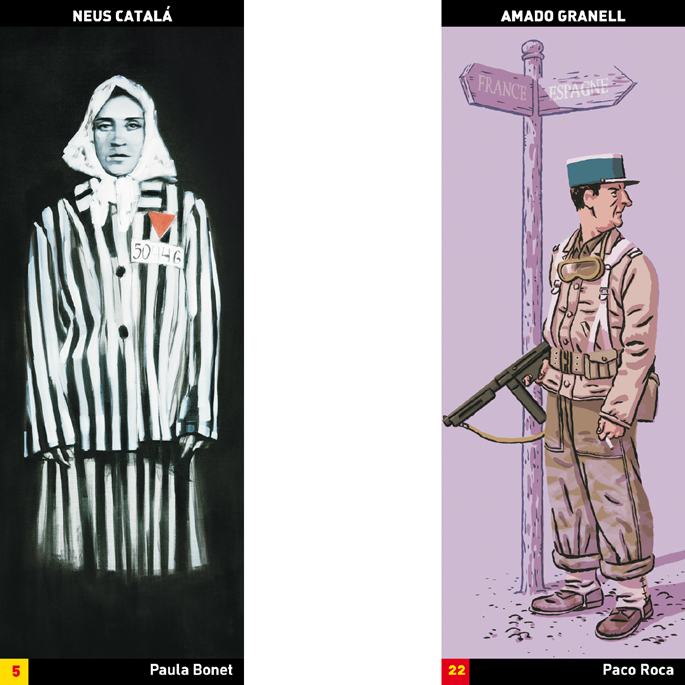 Sento Llobell, Juan Negrín; Micharmut, Manuel Azaña; Max Vento, Giral José; Ajubel, Max Aub; Paula Bonet, Neus Catalá; Luis Demano, Clara Campoamor; Nacho Casanova, Antonio Machado; Rafa Fonteriz, Josep Renau; Salvador Larroca, Rafael Alberti; Martín López, Rodolfo Llopis; Sergi Bleda, Alejandra Soler; Carlos Ortín, Pedro Salinas; David de las Heras, Miguel Buiza; Calpurnio, Ramón J. Sender; Juan Miguel Aguilera, Francisco Ayala; Nacho Lavernia, Constancia de la Mora; César Moragues, Ignacio Hidalgo de Cisneros; Omega, Cipriano Mera; Maria Herreros, Dolores Ibarruri; Malota, Antonio Cordón; Manel Gimeno, Joan Pujol «Garbo»; Paco Roca, Amado Granell; Calo, Guillermina Medrano; Mar Silvestre, Margarita Nelken; Cento Yuste, Manuel Tuñón de Lara; Jordi Bayarri, María Teresa León; Paco Giménez, Margarita Xirgu; Ortifus, Castelao; Juan Almela, Federica Montseny; Jorge Parras, Largo Caballero; Cachete Jack, Juan García Oliver; Txemacantropus, Angelí Castanyer i Fons; Cristina Durán, Josep Castanyer i Fons; Esteban Hernández, José Puche Álvarez; Mique Beltrán, Luis Buñuel; Mik Varo, Araceli González Carballo.