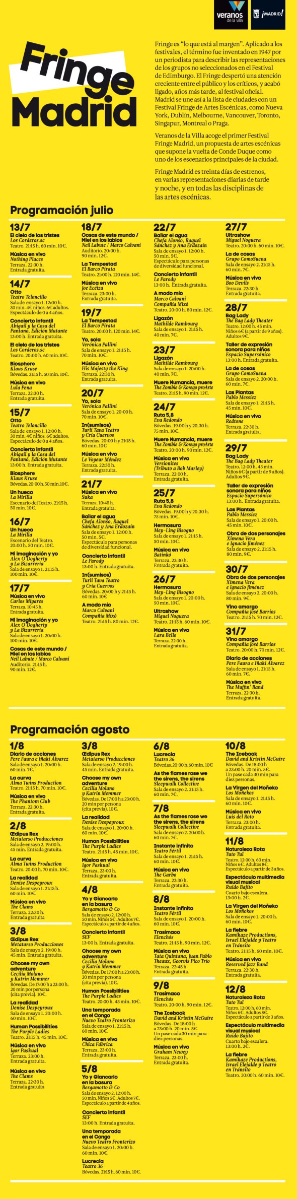 Fringe es una convocatoria abierta nacional e internacional, que nace con el espíritu de convertirse en escaparate de las propuestas más arriesgadas. Treinta días de estrenos en varias representaciones diarias de tarde y noche, y en todas las disciplinas de las artes escénicas: