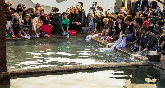 El próximo viernes dia 15, a las 21.30 h. como parte de la Nit de l’Art tendrá lugar en el Espai d´Art Contemporani de Castelló la presentación del vídeo La-Re-Mi-La Festa de la roba bruta que da cuenta del evento con el mismo nombre desarrollado el pasado Abril de 2014 en la población castellonense de San Mateu a iniciativa del EACC. La proyección estará acompañada de la música de la banda de Sant Mateu que interpretará música de Carles Santos. Se trata de un proyecto del artista barcelonés Jordi Colomer, que convocó la colaboración del compositor y de la Banda así como de buena parte de los habitantes de la localidad de Sant Mateu para la creación de una macro-performance, una fiesta popular, que consistía en un recorrido entre los 2 edificios de lavaderos públicos que se encuentran a uno y otro lado del centro de la ciudad y que datan de los primeros años del franquismo, con una singular arquitectura «neo-popular»o de Estilo «vernacular-español», hoy visitados por los turistas, pero en evidente desuso. En los lavaderos, mientras la banda tocaba la música delirante de Carles Santos, y el cantante iniciaba un strip-tease, los hombres y mujeres del pueblo de todas la edades -a los que se añadieron algunos forasteros de paso- enjabonaban con garbo, sábanas, calcetines y ropa interior, acto catártico colectivo encaminado a contradecir el dicho según el cual «la ropa sucia se lava en casa» e invitando por el contrario a una limpieza general nada discreta. Posteriormente todos los participantes se dirigían al segundo lavadero, donde se terminaba el proceso de enjuagado, para acabar colgando la ropa limpia en un gran tendedero instalado en plena vía pública. Durante el recorrido, una especie de procesión laica, sonaba obsesivamente la música repetitiva del La, Re, Mi, La, una pieza de Santos para piano que data del año 1979 y que fue adaptada para banda y tenor en esta ocasión a propuesta de Colomer. El evento obtuvo un formidable éxito de participación popular, y tiene vocación de establecerse como fiesta tradicional, que se celebre todos los años.