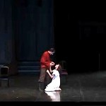 El Teatro Real ha acogido de nuevo a la Compañía Nacional de Danza para estrenar el martes 16 de abril, una nueva producción del ballet Romeo y Julieta, con coreografía de Goyo Montero, responsable también de la dirección, escenografía, vestuario e iluminación, que se podrá ver en el escenario de la Plaza de Oriente hasta el 27 de abril. Hay que hacer otras lecturas de los ballets que han marcado historia, de nada sirve quedarse pensando que cualquier tiempo pasado fue mejor. Creo que este espectáculo tiene muchos elementos de interés que el público agradece con bravos al finalizar la función. Por encima de todo, destacaría el personaje en sombrado que introduce cada acto con unos breves comentarios en inglés sobre el texto de Shakespeare; genera la sensación de alguien que hace la premoción de una historia trágica a su pesar. Este mismo personaje transita por todo el ballet, observando, manipulando o acompañando la acción; es la mirada del destino que espera atenta a que todo se realice como está previsto. La dramaturgia de la obra ha respetado todos los momentos importantes en Romeo y Julieta para que podamos seguir los acontecimientos leyendo en los cuerpos y movimientos de los intérpretes. El elenco de bailarines defiende con entusiasmo la propuesta de Goyo Montero, creando por momentos verdaderos paisajes corporales. Y los protagonistas están acordes a su rol. Tal vez, la luz, el vestuario y el espacio quedan algo planos; el director debería haber tenido aportaciones de otros creadores para elaborar una mayor complejidad estética en la escena.