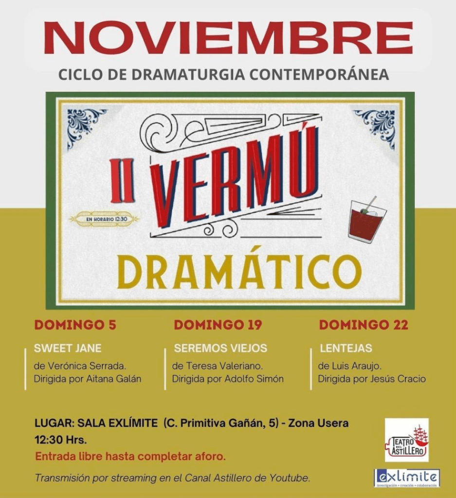 1 de noviembre de 2023 | Categories: NOTICIAS | Comentarios desactivados en NOVIEMBRE-Ciclo de Dramaturgia Contemporánea…II VERMÚ DRAMÁTICO